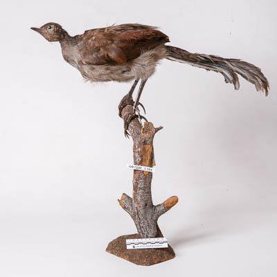 Чучело. Большая птица-лира. Menura novaehollandiae (Latham,1801). Классификация: Хордовые Chordata, Позвоночные Vertebrata, Птицы Aves, Воробьинообразные Passeriformes, Лирохвостые Menuridae, Большая птица-лира Menura novaehollandiae (Latham,1801)