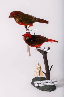 Чучело. Малая черно-красная котинга. Phoenicercus carnifex (L., Классификация: Хордовые Chordata, Позвоночные Vertebrata, Птицы Aves, Воробьинообразные Passeriformes, Котинговые Cotingidae, Малая черно-красная котинга Phoenicercus carnifex (L.,