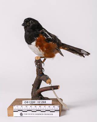 Чучело. Красноглазый тауи. Pipilo erythrophthalmus (L.,1758). Классификация: Хордовые Chordata, Позвоночные Vertebrata, Птицы Aves, Воробьинообразные Passeriformes, Овсянковые Emberizidae, Красноглазый тауи Pipilo erythrophthalmus (L.,1758)