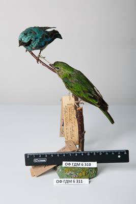 Чучело. Ласточковая танагра. Tersina viridis (Illiger). Классификация: Хордовые Chordata, Позвоночные Vertebrata, Птицы Aves, Воробьинообразные Passeriformes, Танагровые Thraupidae, Ласточковая танагра Tersina viridis (Illiger,1811)