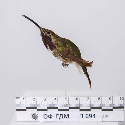 Чучело. Синебородый украшенный колибри. Calothorax lucifer (Swainson,1827). Классификация: Хордовые Chordata, Позвоночные Vertebrata, Птицы Aves, Стрижеобразные Apodiformes, Колибри Trochilidae, Синебородый украшенный колибри Calothorax lucifer (Swainson,1827)