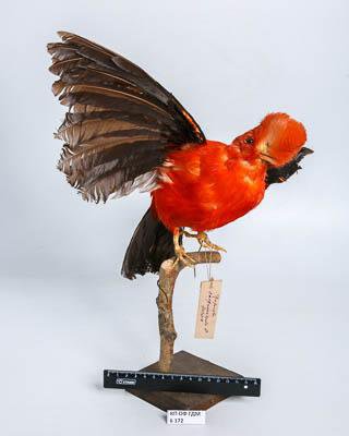 Чучело. Красный каменный петушок. Rupicola sanguinolenta Gould,1859. Классификация: Хордовые Chordata, Позвоночные Vertebrata, Птицы Aves, Воробьинообразные Passeriformes, Котинговые Cotingidae, Красный каменный петушок Rupicola sanguinolenta Gould,1859