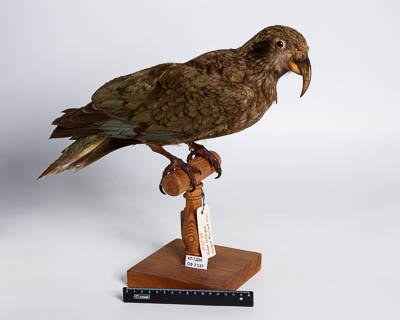 Чучело. Попугай Кеа. Nestor notabilis Gould,1856. Классификация: Хордовые Chordata, Позвоночные Vertebrata, Птицы Aves, Попугаеобразные Psittaciformes, Попугаевые Psittacidae, Кеа Nestor notabilis Gould,1856