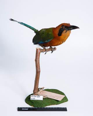 Чучело. Момот рыжый. Urospatha martii (Spix,1824). Классификация: Хордовые Chordata, Позвоночные Vertebrata, Птицы Aves, Ракшеобразные Coraciiformes, Момотовые Momotidae, Рыжий момот Baryphthengus martii (Spix,1824)