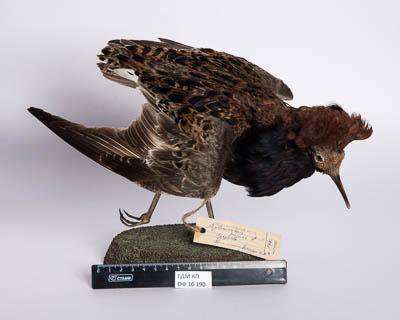 Чучело. Турухтан. Philomachus pugnax (L.,1758). Классификация: Хордовые Chordata, Позвоночные Vertebrata, Птицы Aves, Ржанкообразные Charadriiformes, Бекасовые Scolopacidae, Турухтан Calidris pugnax (L.,1758)