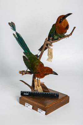 Чучело. Момот.... Prionorhinchus platyrhynchus. Классификация: Хордовые Chordata, Позвоночные Vertebrata, Птицы Aves, Ракшеобразные Coraciiformes, Момотовые Momotidae, Плоскоклювый момот Electron platyrhynchum (Leadbeater,1829)