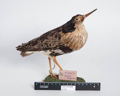 Чучело. Турухтан. Philomachus pugnax (L.,1758). Классификация: Хордовые Chordata, Позвоночные Vertebrata, Птицы Aves, Ржанкообразные Charadriiformes, Бекасовые Scolopacidae, Турухтан Calidris pugnax (L.,1758)