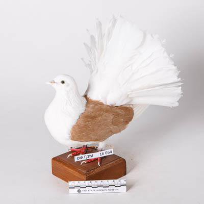 Чучело. Голубь породы краснобокий павлин. Columba livia. Классификация: Хордовые Chordata, Позвоночные Vertebrata, Птицы Aves, Голубеобразные Columbiformes, Голубиные Columbidae