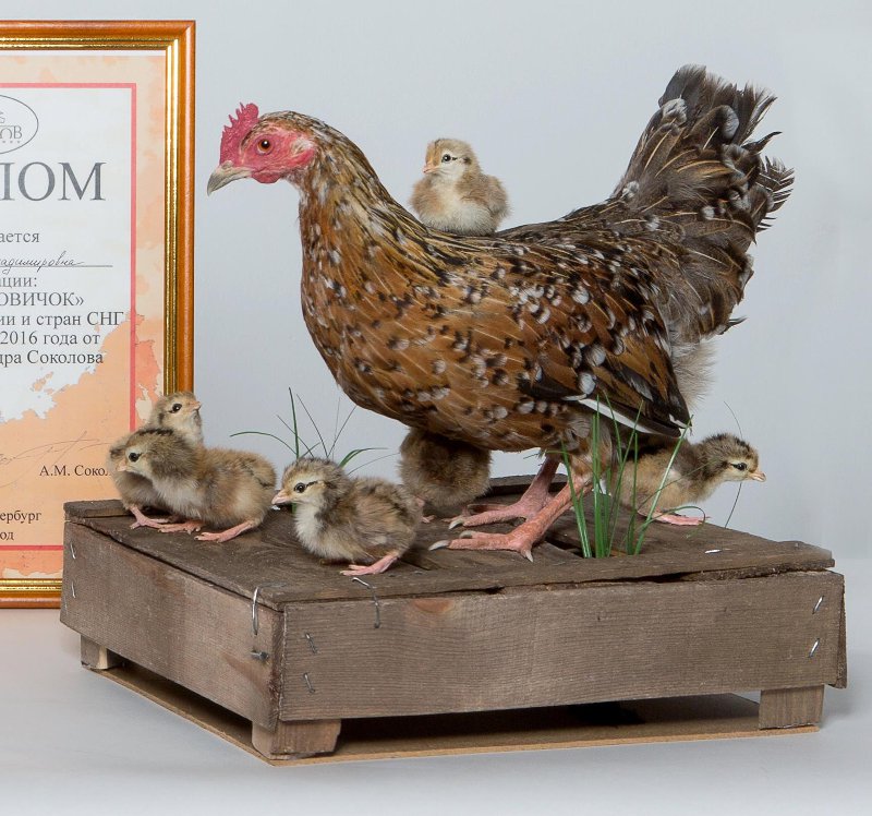 Чучело в биогруппе. Цыпленок русской карликовой породы (Королек). Классификация: Хордовые Chordata, Позвоночные Vertebrata, Птицы Aves, Курообразные Galliformes, Фазановые Phasianidae, Домашняя курица