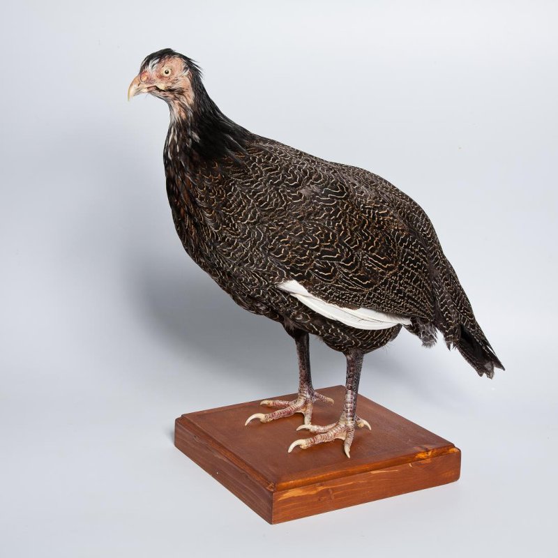 Чучело. Гибрид загорской цесарки и петуха породы Юрловская голосистая. Классификация: Хордовые Chordata, Позвоночные Vertebrata, Птицы Aves, Курообразные Galliformes