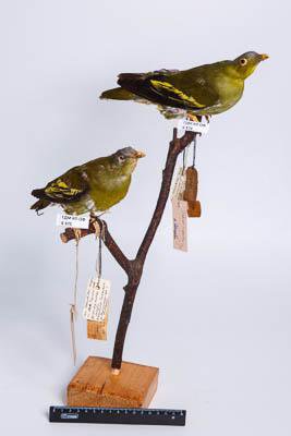 Чучело. Толстоклювый зеленый голубь. Treron curvirostra (Gmelin)? Классификация: Хордовые Chordata, Позвоночные Vertebrata, Птицы Aves, Голубеобразные Columbiformes, Голубиные Columbidae, Толстоклювый зеленый голубь Treron curvirostra (Gmelin, 1789)
