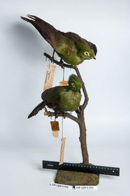 Чучело. Гвинейский турако. Touraco persa (L.,1766). Классификация: Хордовые Chordata, Позвоночные Vertebrata, Птицы Aves, Кукушкообразные Cuculiformes, Тураковые Musophagidae, Гвинейский турако Touraco persa (L.,1758)