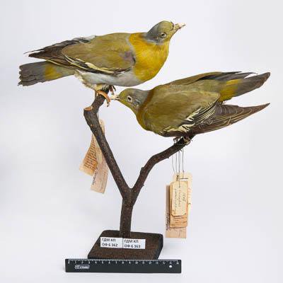 Чучело в биогруппе. Желтоногий зеленый голубь. Treron phoenicoptera (Latham,1790). Классификация: Хордовые Chordata, Позвоночные Vertebrata, Птицы Aves, Голубеобразные Columbiformes, Голубиные Columbidae, Желтоногий зеленый голубь Treron phoenicopterus (Latham,1790)