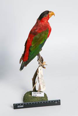 Чучело. Пурпурнобрюхий лори. Lorius hypoinochrous Gray,1859. Классификация: Хордовые Chordata, Позвоночные Vertebrata, Птицы Aves, Попугаеобразные Psittaciformes, Попугаевые Psittacidae, Пурпурнобрюхий широкохвостый лори Lorius hypoinochrous Gray,1859