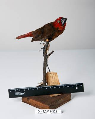 Чучело. Большеклювый астрильд. Pyrenestes ostrinus (Vieillot,1805). Классификация: Хордовые Chordata, Позвоночные Vertebrata, Птицы Aves, Воробьинообразные Passeriformes, Астрильдовые Estrildidae, Большеклювый астрильд Pyrenestes ostrinus (Vieillot,1805)