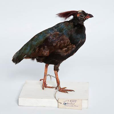 Чучело. Венценосная куропатка. Rollulus roulroul (Scopoli). Классификация: Хордовые Chordata, Позвоночные Vertebrata, Птицы Aves, Курообразные Galliformes, Фазановые Phasianidae, Венценосная куропатка Rollulus rouloul (Scopoli,1786)