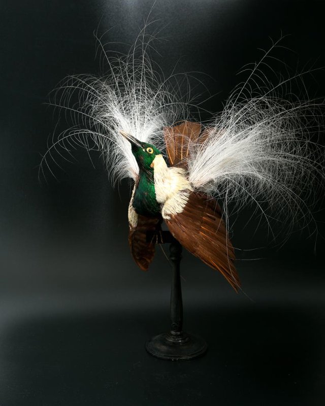 Чучело. Белая райская птица. Paradisaea guilielmi Cabanis,1888. Классификация: Хордовые Chordata, Позвоночные Vertebrata, Птицы Aves, Воробьинообразные Passeriformes, Райские птицы Paradisaeidae, Императорская райская птица Paradisaea guilielmi Cabanis,1888