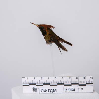 Чучело. Блестящий колибри-кокетка. Lophornis stictolopha Salvin et Elliot,1873. Классификация: Хордовые Chordata, Позвоночные Vertebrata, Птицы Aves, Стрижеобразные Apodiformes, Колибри Trochilidae, Блестящий колибри-кокетка Lophornis stictolophus Salvin et Elliot,1873