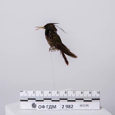Чучело. Чернохохлый колибри-пафозия. Paphosia helenae (Delattre,1843). Классификация: Хордовые Chordata, Позвоночные Vertebrata, Птицы Aves, Стрижеобразные Apodiformes, Колибри Trochilidae, Чернохохлый колибри-кокетка Lophornis helenae (Delattre,1843)