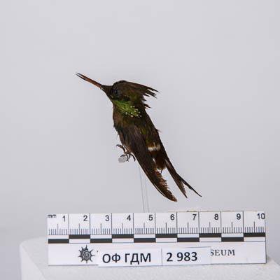 Чучело. Колибри-кокетка. Polemistria chalybea (Vieillot,1823). Классификация: Хордовые Chordata, Позвоночные Vertebrata, Птицы Aves, Стрижеобразные Apodiformes, Колибри Trochilidae, Бородатый колибри-кокетка Lophornis chalybeus (Temminck,1821)