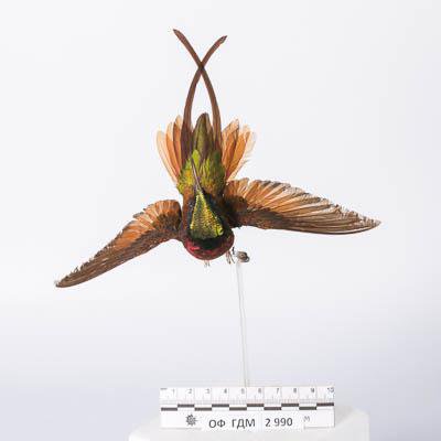 Чучело. Топазовый колибри. Topaza pella (L.,1758). Классификация: Хордовые Chordata, Позвоночные Vertebrata, Птицы Aves, Стрижеобразные Apodiformes, Колибри Trochilidae, Колибри-топаз Topaza pella (L.,1758)