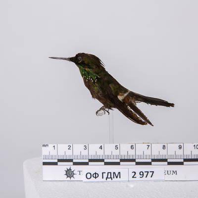 Чучело. Колибри-кокетка. Polemistria chalybea (Vieillot,1823). Классификация: Хордовые Chordata, Позвоночные Vertebrata, Птицы Aves, Стрижеобразные Apodiformes, Колибри Trochilidae, Бородатый колибри-кокетка Lophornis chalybeus (Temminck,1821)