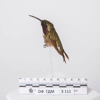 Чучело. Синебородый украшенный колибри. Calothorax lucifer (Swainson,1827). Классификация: Хордовые Chordata, Позвоночные Vertebrata, Птицы Aves, Стрижеобразные Apodiformes, Колибри Trochilidae, Синебородый украшенный колибри Calothorax lucifer (Swainson,1827)