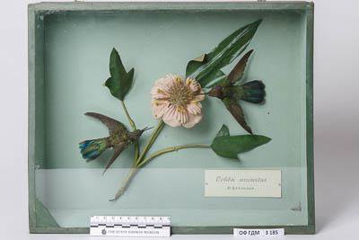 Чучело. Аметистовоухий колибри. Colibri serrirostris (Vieillot,1816). Классификация: Хордовые Chordata, Позвоночные Vertebrata, Птицы Aves, Стрижеобразные Apodiformes, Колибри Trochilidae, Аметистовоухий колибри-фиалкоух Colibri serrirostris (Vieillot,1816)