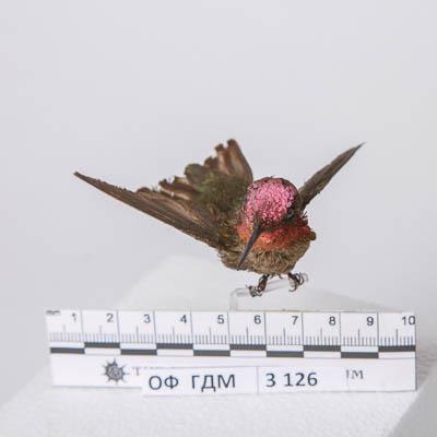 Чучело. Колибри Анны. Calypte anna (Lesson,1829). Классификация: Хордовые Chordata, Позвоночные Vertebrata, Птицы Aves, Стрижеобразные Apodiformes, Колибри Trochilidae, Колибри Анны Calypte anna (Lesson,1829)