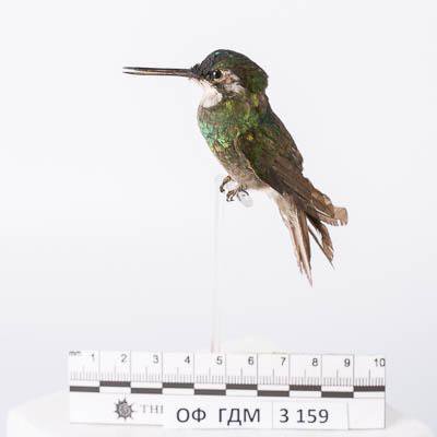 Чучело. Белогорлый сверкающий колибри. Lampornis castaneoventris (Gould,1851). Классификация: Хордовые Chordata, Позвоночные Vertebrata, Птицы Aves, Стрижеобразные Apodiformes, Колибри Trochilidae, Белогорлый сверкающий колибри Lampornis castaneoventris (Gould,1851)
