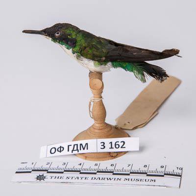 Чучело. Пурпурноголовый ушастый колибри. Heliothryx barroti (Bourcier,1843). Классификация: Хордовые Chordata, Позвоночные Vertebrata, Птицы Aves, Стрижеобразные Apodiformes, Колибри Trochilidae, Пурпурноголовый ушастый колибри Heliothryx barroti (Bourcier,1843)
