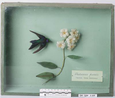 Чучело. Ласточковый колибри-талурания. Thalurania furcata (Gmelin,1788). Классификация: Хордовые Chordata, Позвоночные Vertebrata, Птицы Aves, Стрижеобразные Apodiformes, Колибри Trochilidae, Ласточковый колибри-талурания Thalurania furcata (Gmelin,1788)