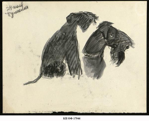 На листе горизонтального формата расположены два наброска терьера (шнауцера). Слева изображен сидящий терьер в профиль направо, глаза не видны под густой челкой, хвост откинут назад. Справа - крупным планом голова этого же терьера. Уши, висящие на хрящах, чуть приподняты, глаза открыты, взгляд направлен вверх и вперед. Собака темно-серого, почти черного окраса.