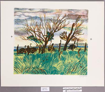 Страусы в вольере. Гравюра