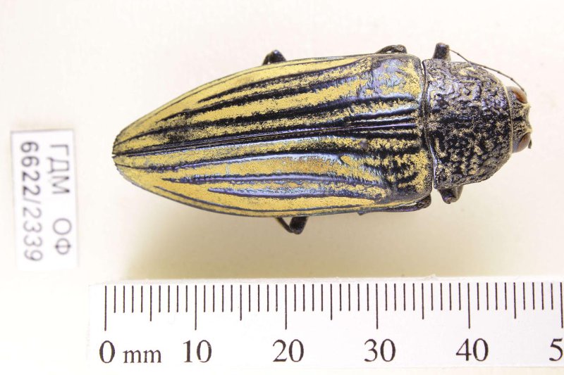 Сухое насекомое. Златка. Pseudotaenia waterhousei (van de Poll, 1886). Классификация: Членистоногие Arthropoda, Насекомые Insecta, Жуки Coleoptera, Златки Buprestidae
