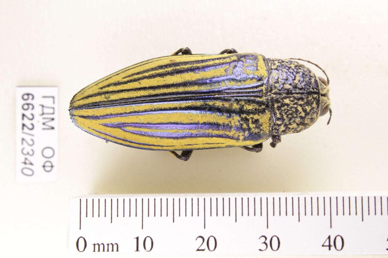 Сухое насекомое. Златка. Pseudotaenia waterhousei (van de Poll, 1886). Классификация: Членистоногие Arthropoda, Насекомые Insecta, Жуки Coleoptera, Златки Buprestidae