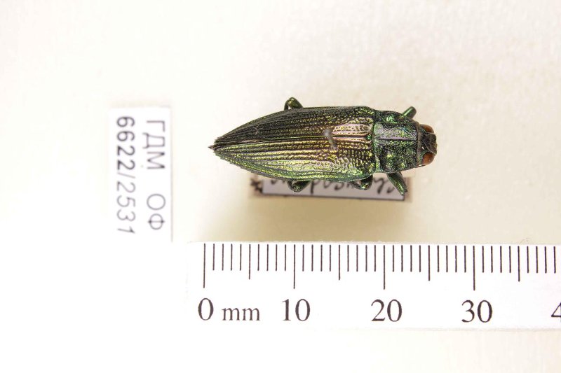 Сухое насекомое. Златка. Chrysodema jucunda Laporte et Gory, 1835. Классификация: Членистоногие Arthropoda, Насекомые Insecta, Жуки Coleoptera, Златки Buprestidae
