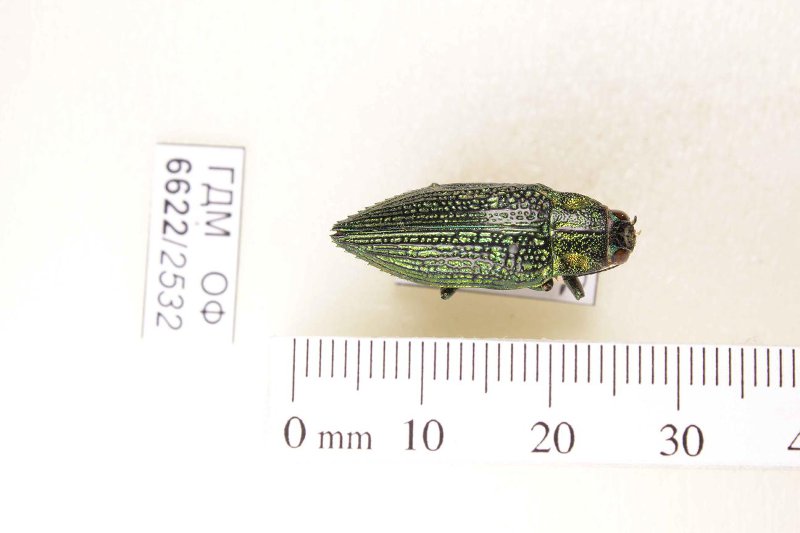 Сухое насекомое. Златка. Chrysodema jucunda Laporte et Gory, 1835. Классификация: Членистоногие Arthropoda, Насекомые Insecta, Жуки Coleoptera, Златки Buprestidae