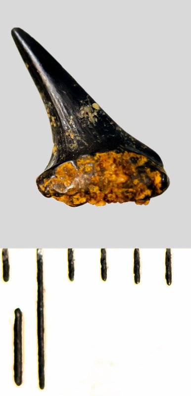 Зуб (фрагмент). Акула. Eostriatolamia subulata (Agassiz, 1843). Классификация: Хордовые Chordata, Позвоночные Vertebrata, Хрящевые рыбы Chondrichthyes, Пластиножаберные Elasmobranchii, Акулы Selachii, Ламнообразные Lamniformes, Песчаные акулы Odontaspididae