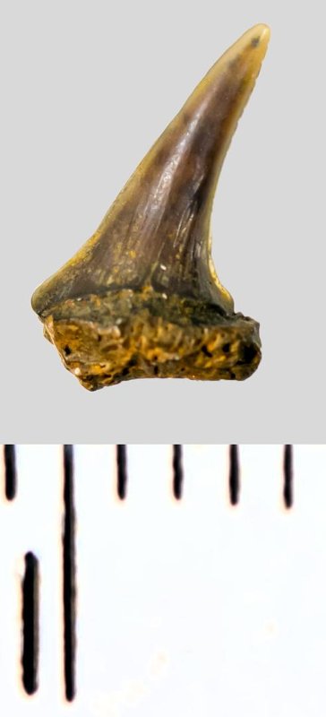 Зуб (фрагмент). Акула. Eostriatolamia subulata (Agassiz, 1843). Классификация: Хордовые Chordata, Позвоночные Vertebrata, Хрящевые рыбы Chondrichthyes, Пластиножаберные Elasmobranchii, Акулы Selachii, Ламнообразные Lamniformes, Песчаные акулы Odontaspididae
