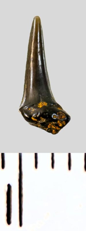 Зуб (фрагмент). Акула. Eostriatolamia subulata (Agassiz, 1843). Классификация: Хордовые Chordata, Позвоночные Vertebrata, Хрящевые рыбы Chondrichthyes, Пластиножаберные Elasmobranchii, Акулы Selachii, Ламнообразные Lamniformes, Песчаные акулы Odontaspididae