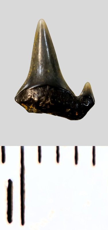 Зуб (фрагмент). Акула. Eostriatolamia subulata (Agassiz, 1843). Классификация: Хордовые Chordata, Позвоночные Vertebrata, Хрящевые рыбы Chondrichthyes, Пластиножаберные Elasmobranchii, Акулы Selachii, Ламнообразные Lamniformes, Песчаные акулы Odontaspididae