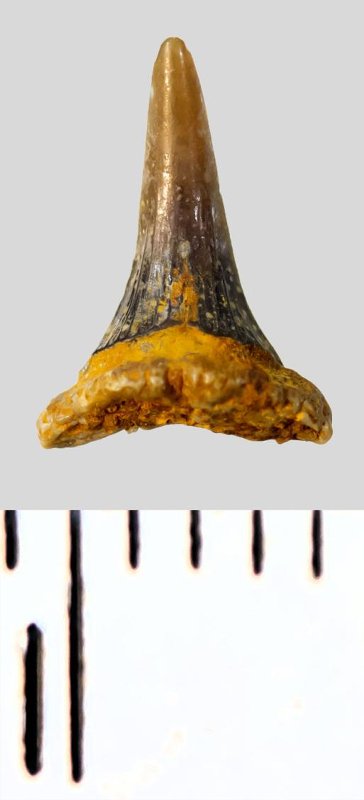 Зуб (фрагмент). Акула. Eostriatolamia subulata (Agassiz, 1843). Классификация: Хордовые Chordata, Позвоночные Vertebrata, Хрящевые рыбы Chondrichthyes, Пластиножаберные Elasmobranchii, Акулы Selachii, Ламнообразные Lamniformes, Песчаные акулы Odontaspididae