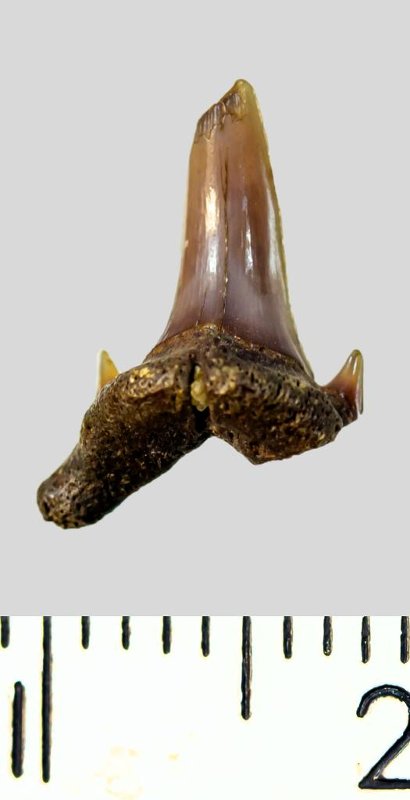 Зуб. Акула. Scapanorhynchus subulata Agassiz, 1843. Классификация: Хордовые Chordata, Позвоночные Vertebrata, Хрящевые рыбы Chondrichthyes, Пластиножаберные Elasmobranchii, Акулы Selachii, Ламнообразные Lamniformes, Песчаные акулы Odontaspididae