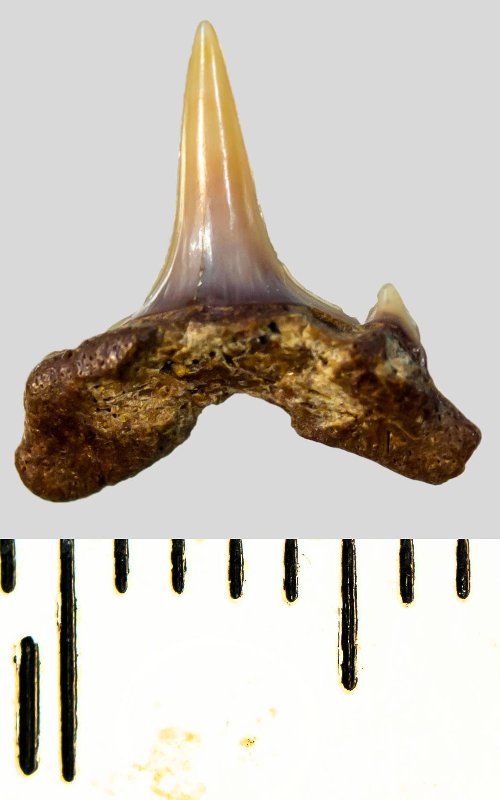 Зуб. Акула. Scapanorhynchus subulata Agassiz, 1843. Классификация: Хордовые Chordata, Позвоночные Vertebrata, Хрящевые рыбы Chondrichthyes, Пластиножаберные Elasmobranchii, Акулы Selachii, Ламнообразные Lamniformes, Песчаные акулы Odontaspididae