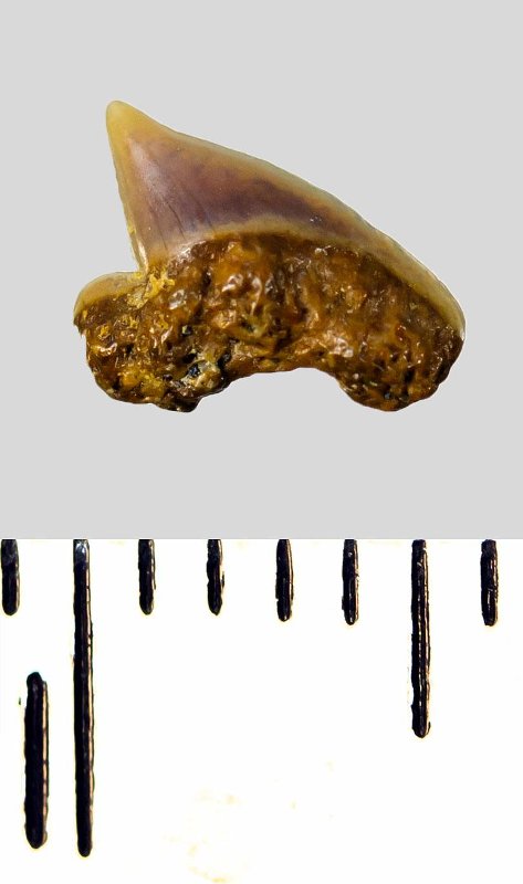 Зуб. Акула. Palaeoanacorax volgensis Glikman, 1971. Классификация: Хордовые Chordata, Позвоночные Vertebrata, Хрящевые рыбы Chondrichthyes, Пластиножаберные Elasmobranchii, Акулы Selachii, Ламнообразные Lamniformes, Anacoracidae
