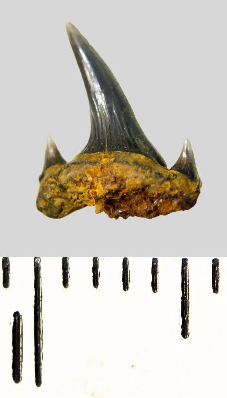 Мелкий боковой зуб с коронкой серого цвета, колюще-режущего типа, S-образно изогнутой, с гладким режущим краем. С лингвальной стороны у основания коронки на эмали имеется скульптура в виде слабой продольной струйчатости. Корень охристый, арочный, умеренно массивный, со следами окатанности. С лингвальной стороны корня одна питательная борозда. Присутствует одна пара добавочных зубцов коронки.