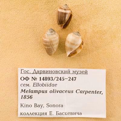 Морской брюхоногий моллюск. Melampus olivaceus Carpenter, 1856. Классификация: Моллюски Mollusca, Брюхоногие Gastropoda, Archaeopulmonata, Ellobiidae