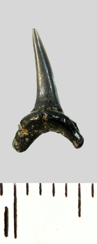 Мелкий боковой зуб с коронкой серого цвета, колюще-режущего типа, S-образно изогнутой, с гладким режущим краем. С лингвальной стороны у основания коронки на эмали имеется скульптура в виде слабой продольной струйчатости. Корень охристый, арочный, умеренно массивный, со следами окатанности. Имеется одна питательная борозда с лингвальной стороны корня. Добавочные зубцы коронки отсутствуют.