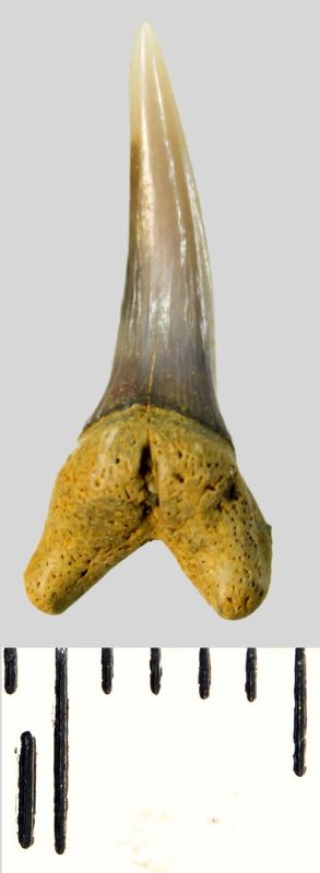 Мелкий боковой зуб с коронкой серого цвета, колюще-режущего типа, S-образно изогнутой, с гладким режущим краем. С лингвальной стороны у основания коронки на эмали имеется скульптура в виде слабой продольной струйчатости. Корень охристый, арочный, умеренно массивный, со следами окатанности. Имеется одна питательная борозда с лингвальной стороны корня. Добавочные зубцы коронки отсутствуют.